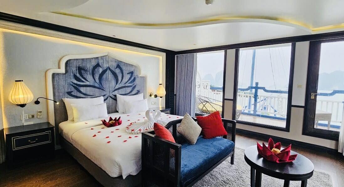 Lotus D'Orient không chỉ mang đến một hành trình khám phá vịnh độc đáo mà còn chú trọng đến trải nghiệm của du khách bằng những dịch vụ tiện ích đẳng cấp. Với không gian sang trọng và thiết kế tinh tế, mỗi cabin trên du thuyền như một khách sạn 5 sao di động trên biển, mang lại sự thoải mái và riêng tư tối đa.